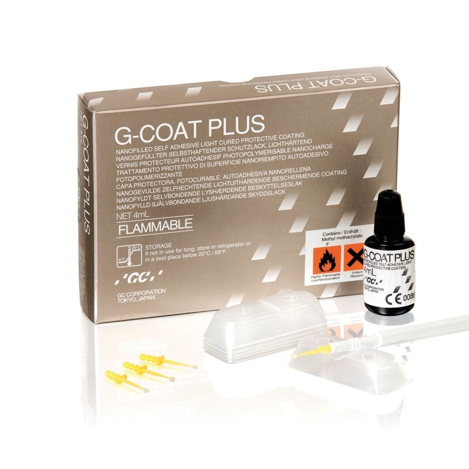 G-Coat Plus™ is a light-cured protective clear coating formulated with adhesive monomer and nanofillers. One thin coat protects margins, prevents staining and proves a high gloss comparable to intense polishing.