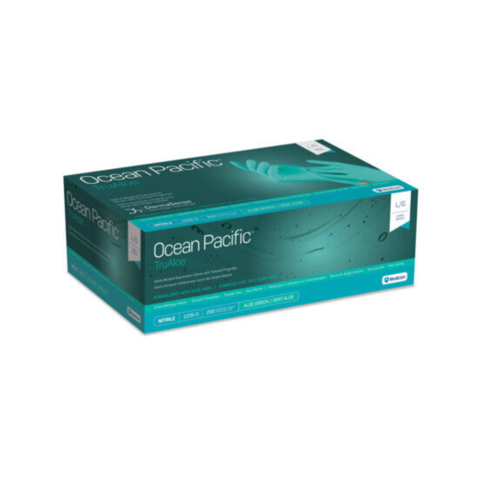Medicom: Ocean Pacific TruAloe Formulated Chemo-Tested Powder-Free Large Gloves 200/Pk – 1226-B Soothe and moisturize your skin with these aloe vera infused gloves. Reduce the risk of developing and/or worsening skin sensitization often caused by chemical accelerators commonly found in other nitrile gloves.