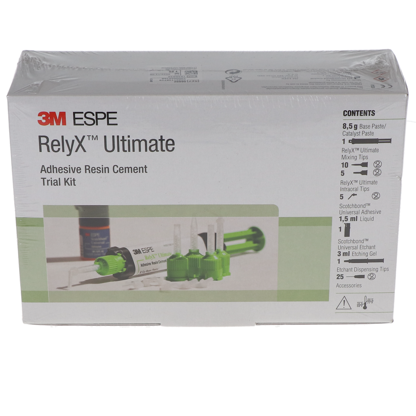 5 ml/Bt Scotchbond universal adhesive, 3 ml etchant syringe, 25 dispensing tips for etchant syringe, 50 micro brushes, 10 regular mixing tips, 5 wide mixing tips, 5 intra-oral tips, technique guide, and instructions for use.