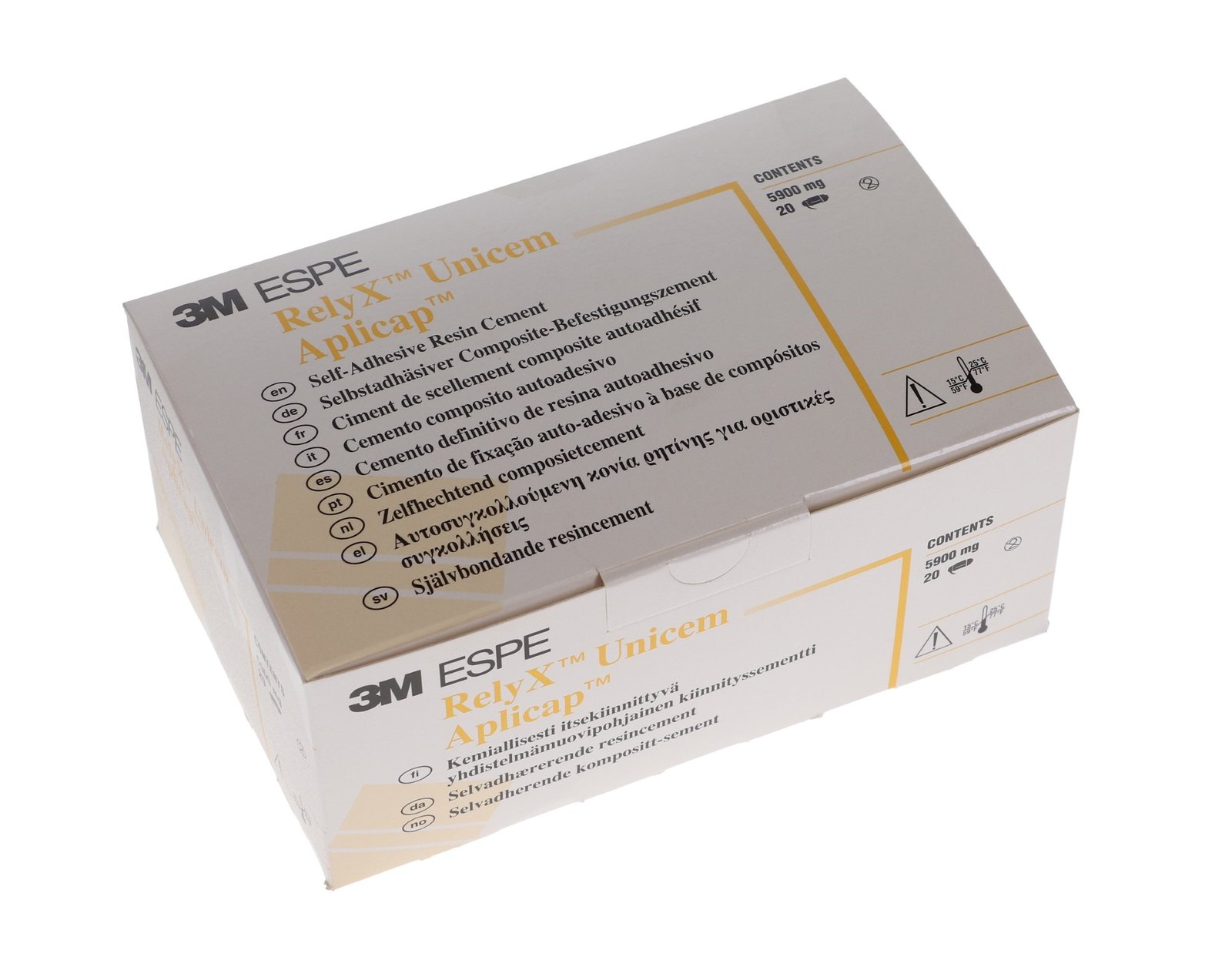 RelyX Unicem Aplicap is a universal resin cement that simplifies techniques by eliminating a complex array of technique-sensitive cement. It has self-adherent and moisture-tolerant properties with improved esthetics for practically all indications, from gold crowns to ceramic inlays.